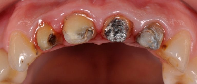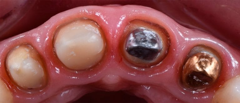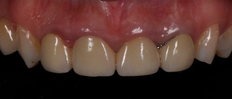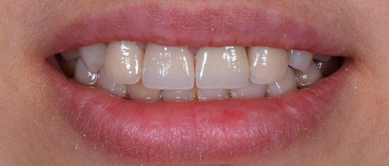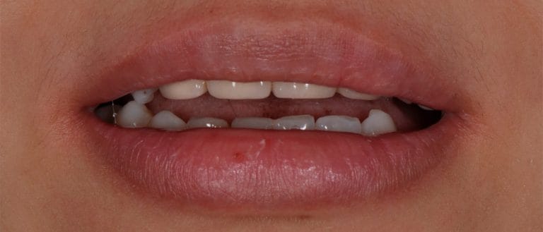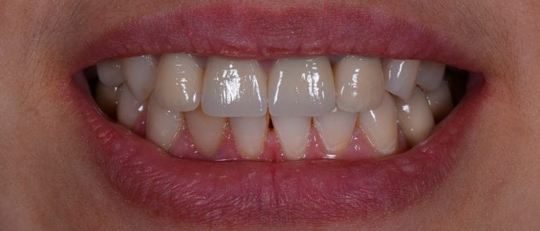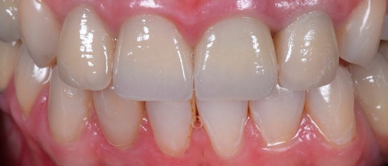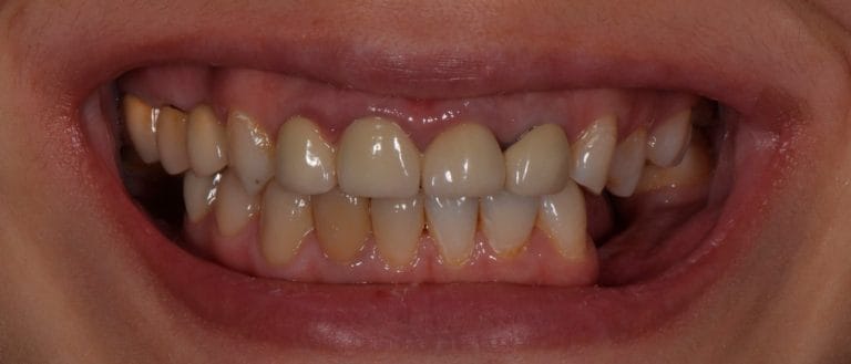 Было проведено снятие старых металлокерамических коронок, эндодонтическое лечение зуба 2.2, лечение кариеса 1.2, 1.1. и изготовлены временные коронки. Вкладка зуба 2.2, полировка зубов. Со временем временные коронки заменены на постоянные из материала E-max.
